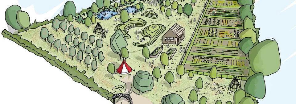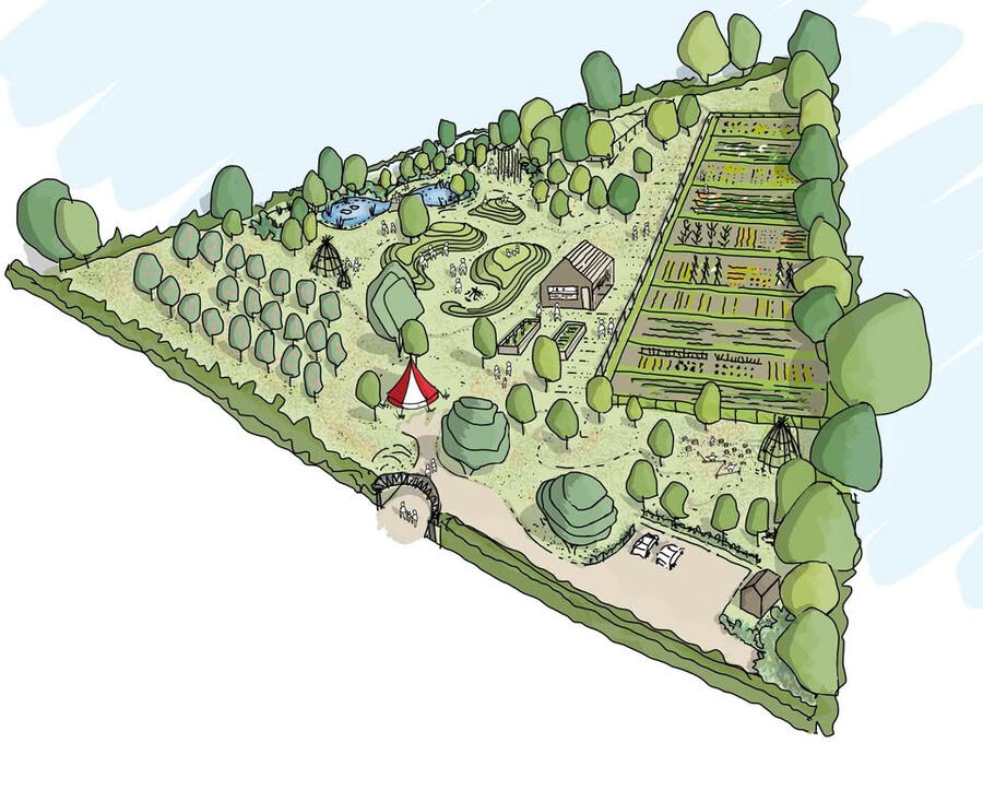 in 2022, under-used existing allotments in Rous Lench were transformed into a community garden with support from Wychavon District Council.Villagers leased the site from St Peter’s Church and re-imagined it as a space for people to meet, children to play, and a venue for community events.Natural play equipment and a slide have been installed, while the site was re-landscaped to create low mounds for climbing and a pond added to boost biodiversity.An existing cider orchard has been added to, with local pear and plum tree varieties planted. The allotments have been split into smaller plots and are now fully let, while new communal accessible raised growing beds have been installed. There is also a clubhouse shed, seating, compost toilet, blue water pump providing a sustainable source of water, and a small car park.